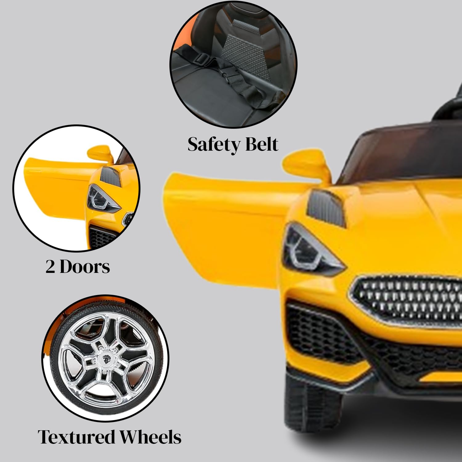 - The car comes in a vibrant Yellow color, which is bright and attractive, appealing to young children.