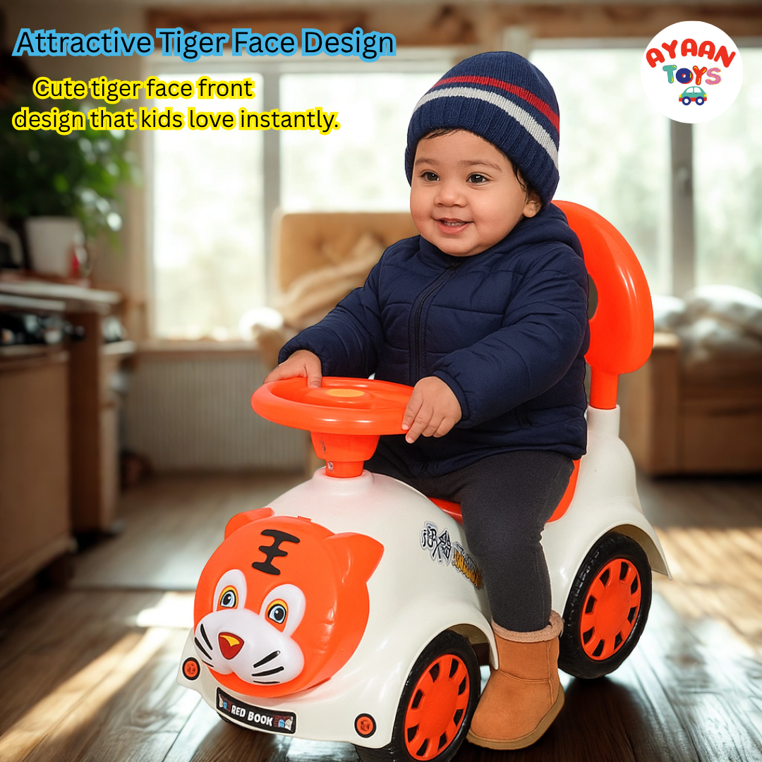 Ayaan Toys - Tiger Face Ride On Car for Kids 1–4 Years | Push Ride On with Backrest & Steering Wheel | Orange & white Baby Ride On Toy | Indoor Outdoor Foot-to-Floor Car